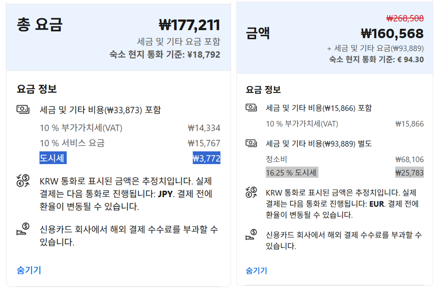 숙박 예약 시 세부 내역을 보면 도시세(City Tax)가 포함되어 있어요. 교토와 파리 숙박 예약창의 모습 ⓒ부킹닷컴 |